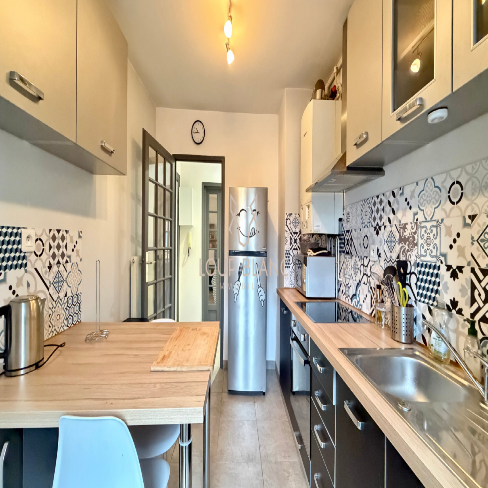L'appartement s'ouvre sur une entrée accueillante qui distribue les différentes pièces de vie. La cuisine séparée est intégralement équipée (électroménager, vaisselle, rangements) et bénéficie d'un atout majeur : un accès direct à un balcon. On retrouve ensuite deux chambres lumineuses, un salon-séjour chaleureux, une salle d'eau fonctionnelle et un WC séparé.