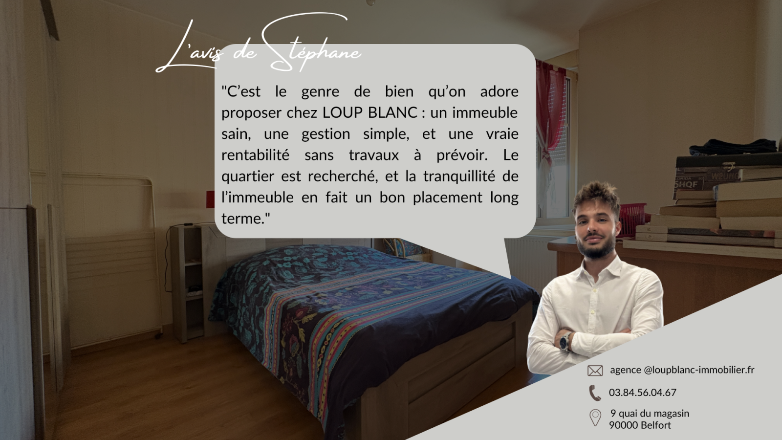 "C’est le genre de bien qu’on adore proposer chez LOUP BLANC : un immeuble sain, une gestion simple, et une vraie rentabilité sans travaux à prévoir. Le quartier est recherché, et la tranquillité de l’immeuble en fait un bon placement long terme."