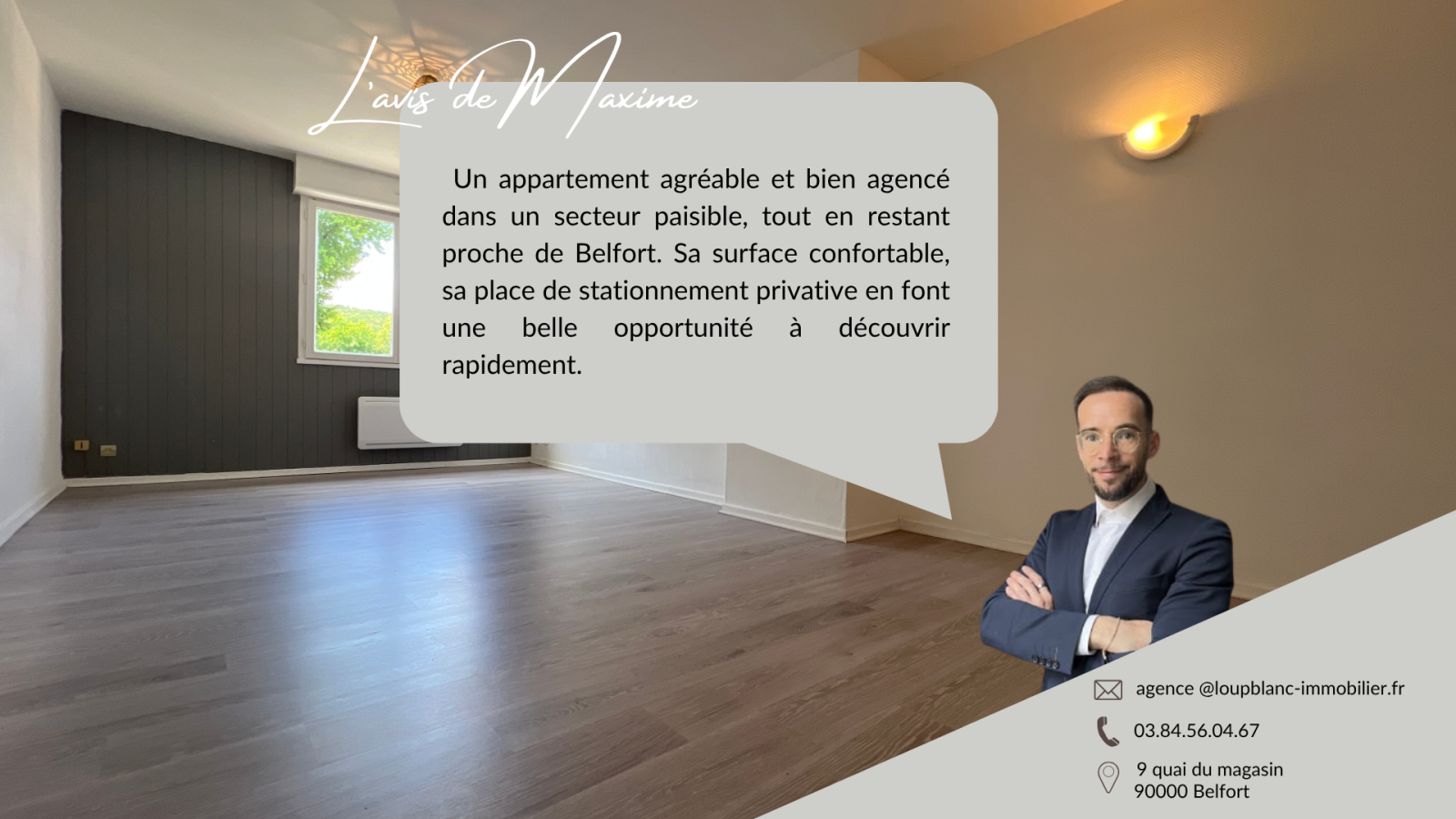 "Un appartement bien pensé, situé dans un quartier calme tout en restant proche de Belfort. La luminosité, la disposition fonctionnelle et la place de stationnement privative en font une belle opportunité, aussi bien pour un occupant que pour un investisseur."