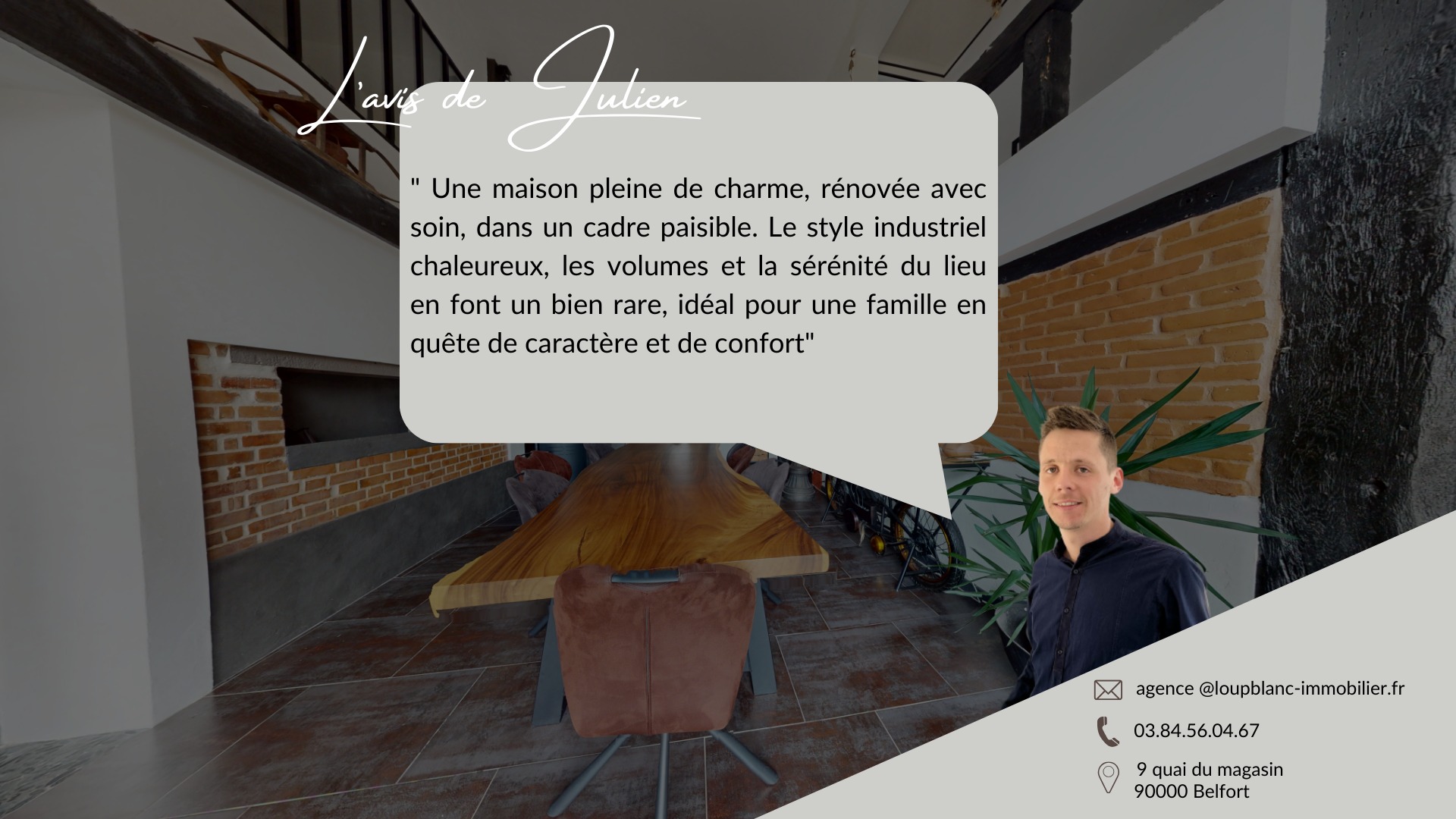 L'avis de Julien : " Une maison pleine de charme, rénovée avec soin, dans un cadre paisible. Le style industriel chaleureux, les volumes et la sérénité du lieu en font un bien rare, idéal pour une famille en quête de caractère et de confort"