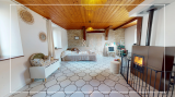 Elle se compose au rez-de-chaussée d’un espace entrée, une cuisine avec direct sur une grande terrasse en bois et d’un salon lumineux avec poêle à granulés.